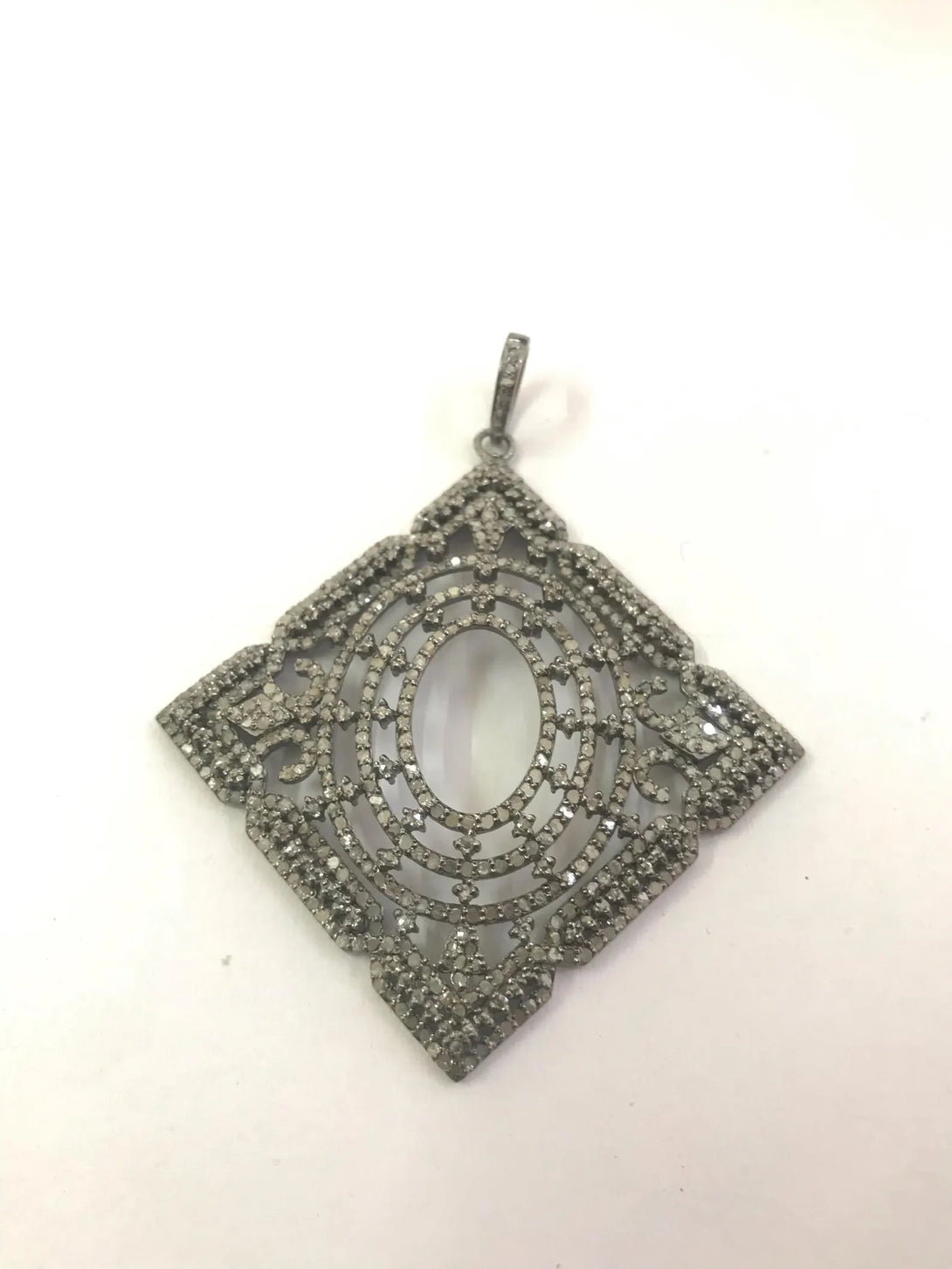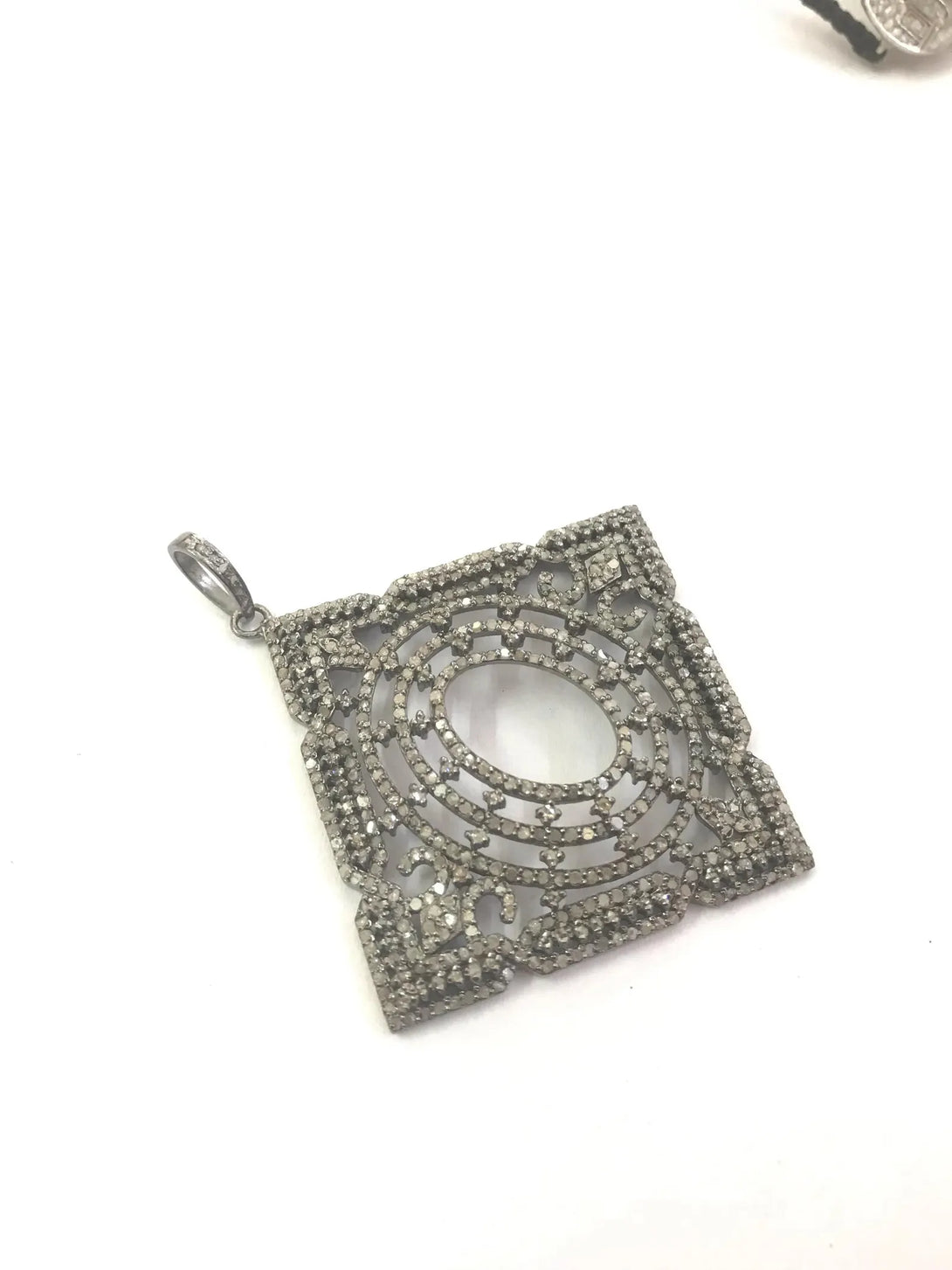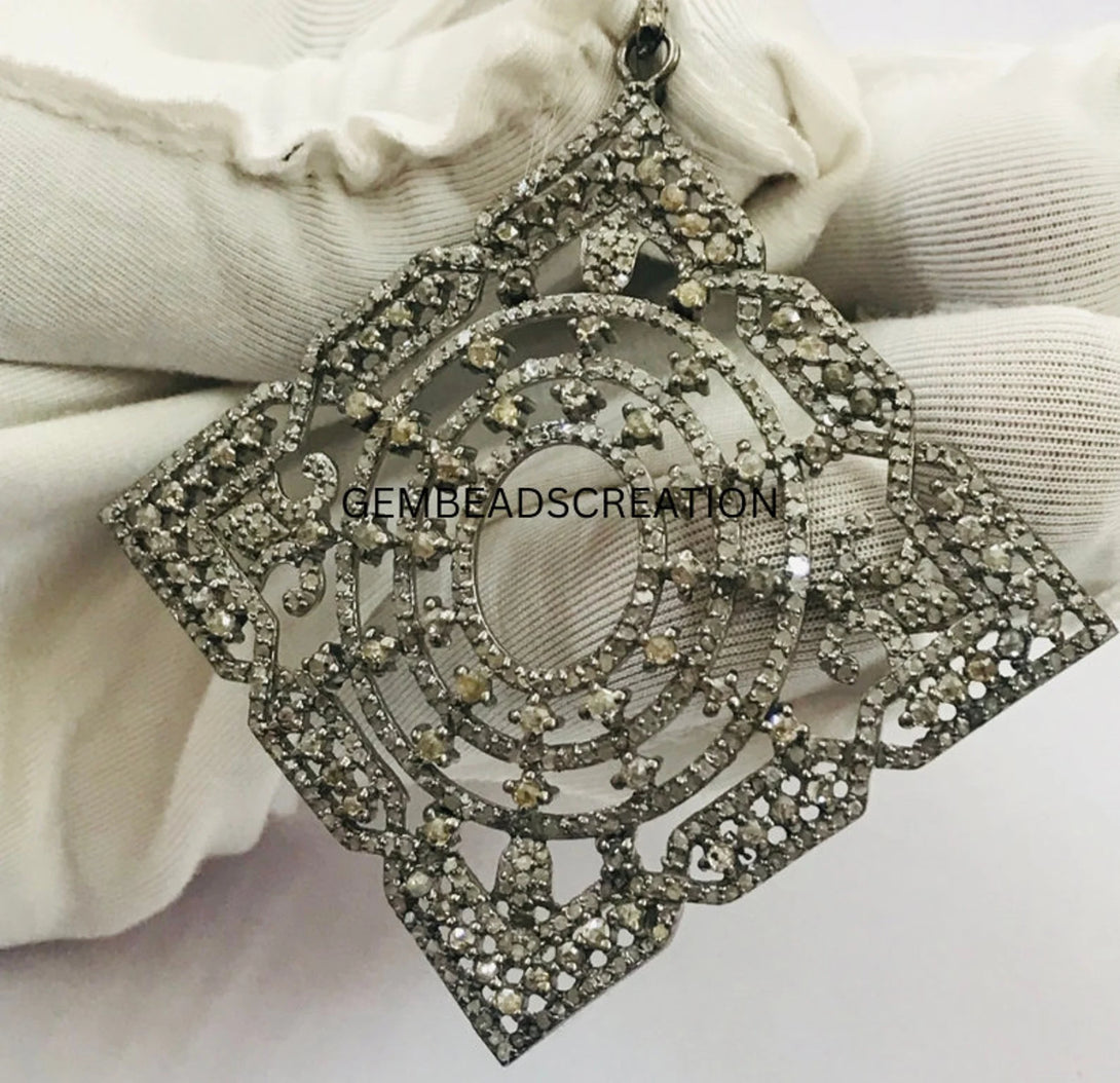 Antique Pave Diamond Pendant: Handmade Filigree 925 Silver Necklace (65x55mm)